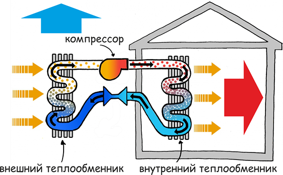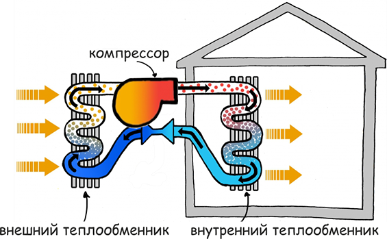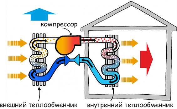 So the refrigerant, evaporating in the indoor or outdoor heat exchanger - absorbs heat either from the room or from the outdoor air.